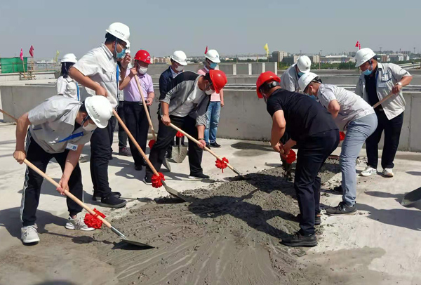 随着建设方代表韦汉英总经理发出“封顶仪式启动”的指令,塔吊启动、泵车轰鸣,正天车间大楼封顶仪式正式开始,扎着红色彩球的混凝土泵送车挥动大臂从地面将混凝土泵送至楼上30米高处的布料斗,塔吊臂跑车滑动,承载着绣带飘扬的料斗平稳的将混凝土运送至浇筑点,三方人员拿起铁锹,挥臂铲砼,完成了最后一立方混凝土的浇筑,共同见证了大楼主体的圆满封顶。